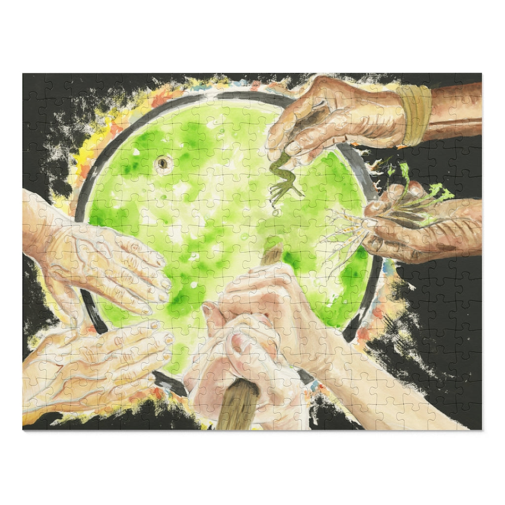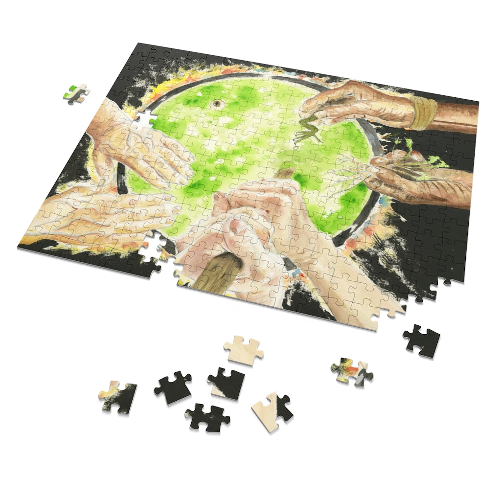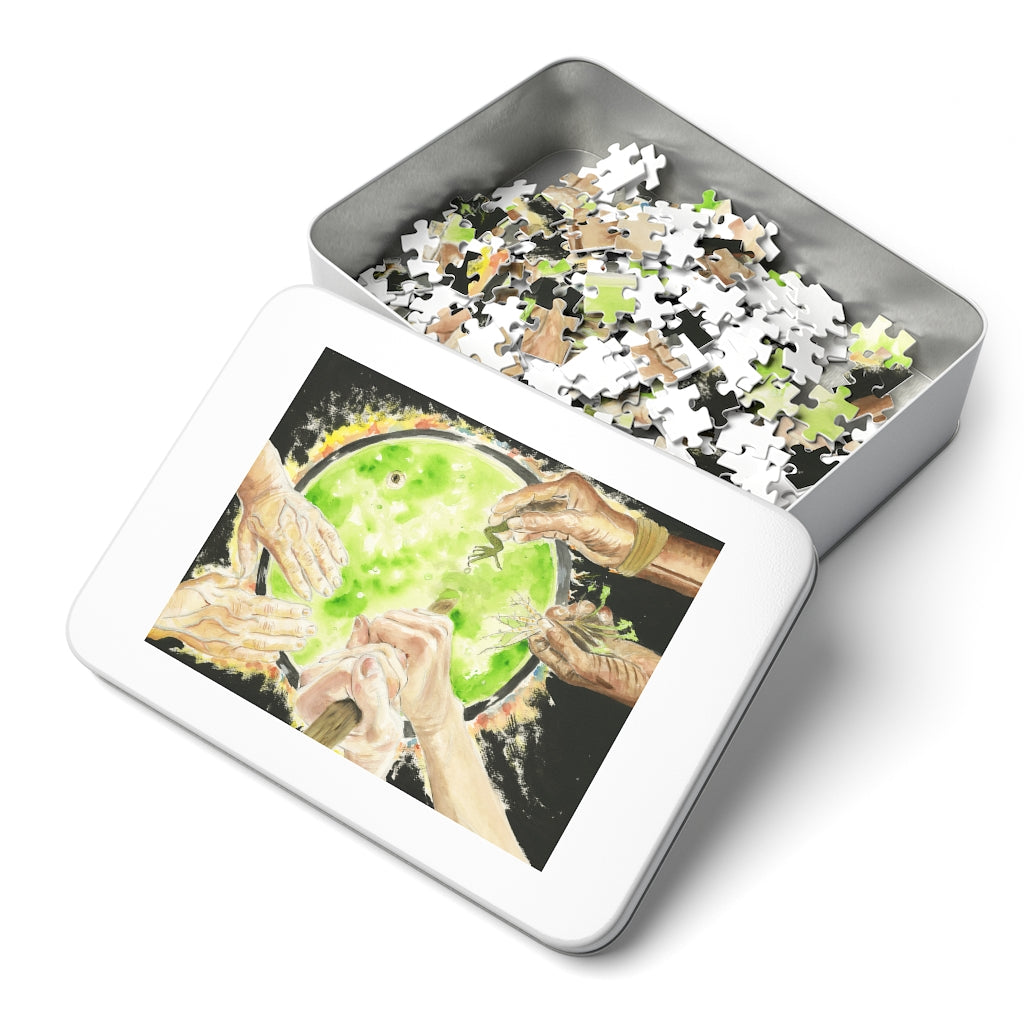 This 252 piece puzzle is available in 11x14 inches. This original artwork is sublimated on chipboard material, then finished in satin. This diecut puzzle board comes contained in a stylish metal tin. The game’s 252 precisely interlocking pieces make an excellent gift for any soon-to-be puzzled enthusiasts. It’s nowhere near the difficulty of a thousand+ pieces while still being challenging enough to draw the whole family’s attention for an evening.